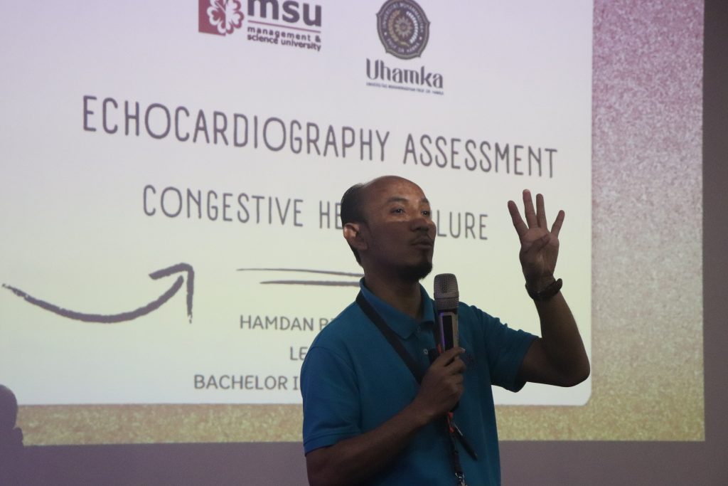 Kuliah umum ini menghadirkan Hamdan Bin Ibrahim, seorang dosen dari Faculty of Health & Life Sciences MSU Malaysia, sebagai narasumber utama dan Ahmad Pitra (Country Manager) Dalam kuliah yang dimoderatori oleh Ilma Savara, Amd. Kes., Hamdan Bin Ibrahim memaparkan berbagai teknik dan variasi dalam pemeriksaan ekhokardiografi pada pasien dengan penyakit jantung koroner (Coronary Heart Disease).