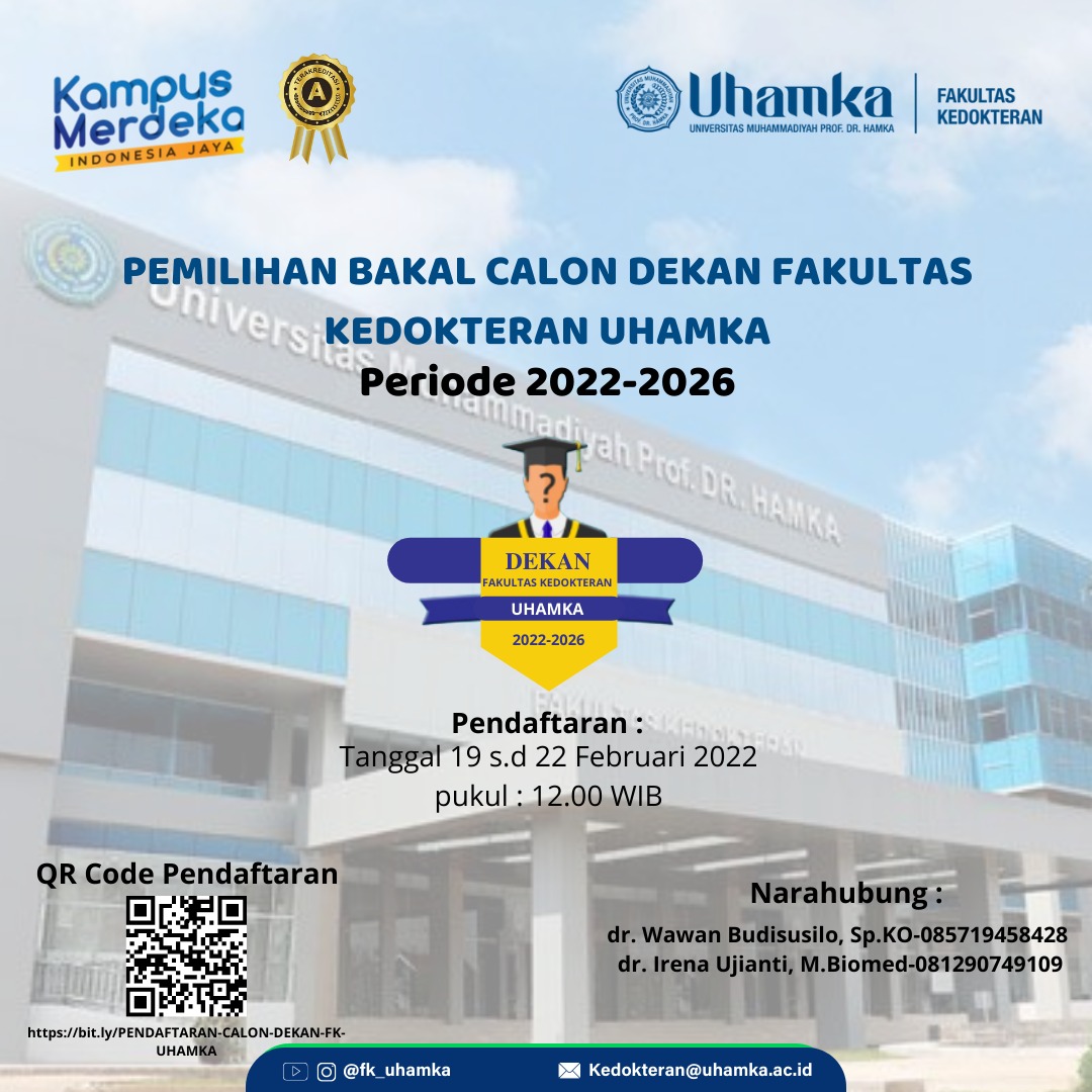 Sehubungan dengan berakhirnya masa jabatan Dekan Fakultas Kedokteran Periode 2018–2022. Panitia Pemilihan Dekan Fakultas Kedokteran menyelenggarakan Penjaringan Bakal Calon Dekan dan Pemilihan Calon Dekan Periode 2022 – 2026. Penjaringan tersebut didasarkan Keputusan slot depo 5k Rektor Universitas Muhammadiyah Prof.Dr.Hamka Nomor 355/A.01.01/2012 Tentang Peraturan Pemilihan Calon Dekan Dilingkungan Universitas Muhammadiyah Prof.Dr.Hamka.